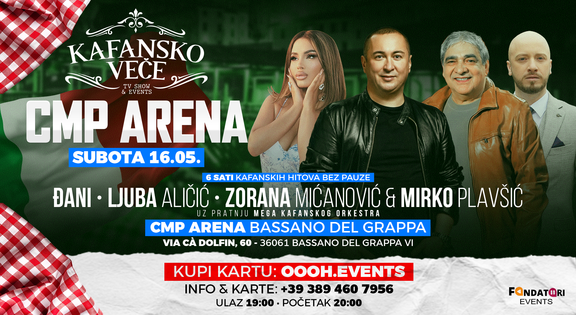 🔥 KAFANSKO VEČE – CMP ARENA 🔥 Sabato 16 Maggio preparati a 6 ore di kafanskih hitova! Sul palco della CMP Arena – Bassano del Grappa: ⭐Đani ⭐Lju...